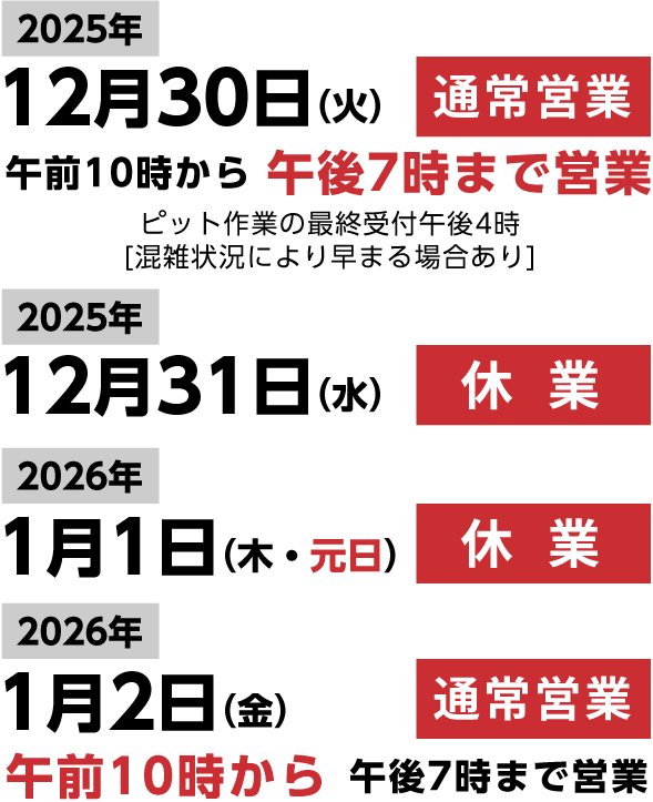 2025年は12月30日(火)午後7時まで営業、ピット作業の最終受付は午後4時ですが混雑状況により早まる場合があります。2025年12月31日(水)と2026年1月1日(木・元日)は休業します。2026年は1月2日(金)午前10時から通常営業となります。年末年始は大変混雑します、早めのご来店をおすすめします。