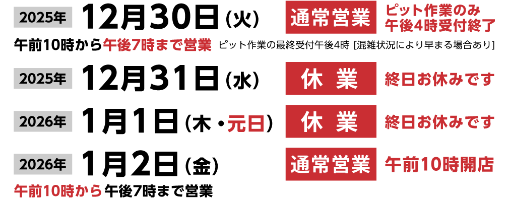 2025年は12月30日(火)午後7時まで営業、ピット作業の最終受付は午後4時ですが混雑状況により早まる場合があります。2025年12月31日(水)と2026年1月1日(木・元日)は休業します。2026年は1月2日(金)午前10時から通常営業となります。年末年始は大変混雑します、早めのご来店をおすすめします。